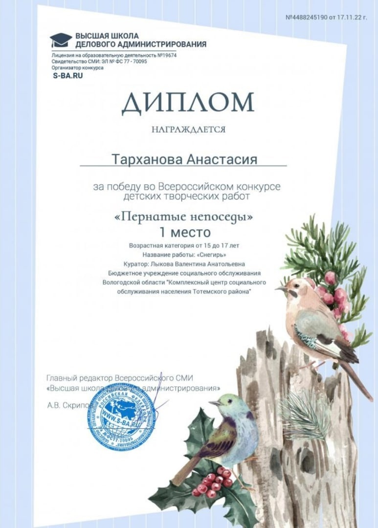 Участник конкурса Тарханова Анастасия, активист волонтерского отряда "Позитив" Комплексного центра социального обслуживания населения Тотемского района приняла участие детском творческом конкурсе "Пернатые непоседы". Занявшая 1 место и награждена дипломом победителя в возрастной категории от 15 до 17 лет.